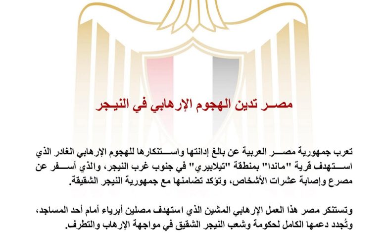 أكمل القراءة »تعرب جمهورية مصر العربية عن بالغ إدانتها واستنكارها للهجوم الإرهابي الغادر الذي استهدف قرية “ماندا” بمنطقة “تيلابيري” في جنوب غرب…