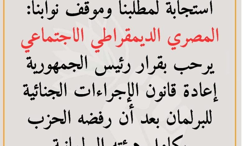 اشاد الحزب المصري الديمقراطي الاجتماعي قرار السيد رئيس الجمهورية بعدم التصديق على قانون الإجراءات الجنائية وإعادته للبرلمان لمراجعته من جديد.…