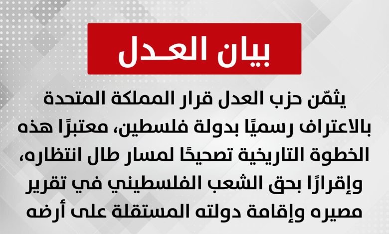 حزب العدل نثمّن قرار المملكة المتحدة بالاعتراف رسميًا بدولة فلسطين