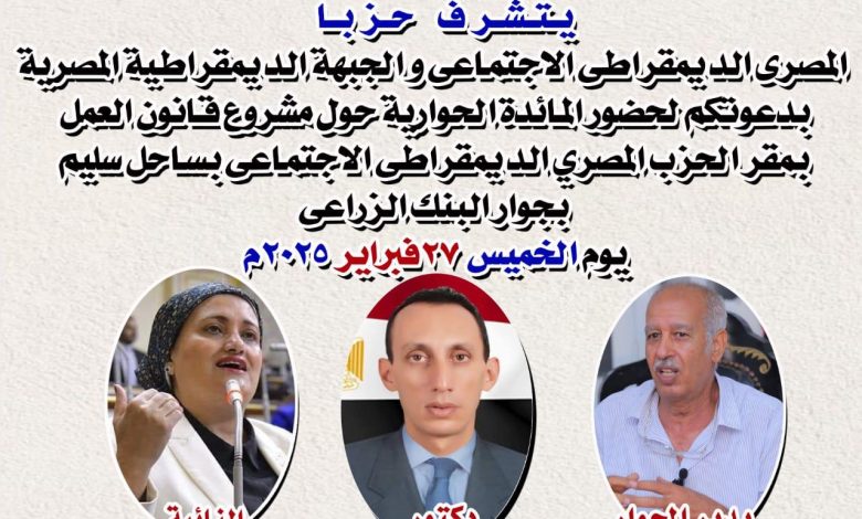 ينظّم الحزبان المصري الديمقراطي الاجتماعي والجبهة الديمقراطية المصرية ندوة حوارية، غدا الخميس ، تحت عنوان “قانون العمل: خطوة للأمام وخطوتان…