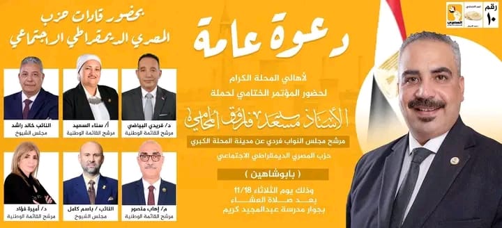 مسعد فاروق سعد يدعو أهالي المحلة للمؤتمر الجماهيري بحضور قيادات حزب المصري الديمقراطي