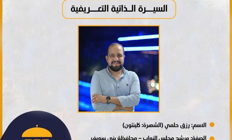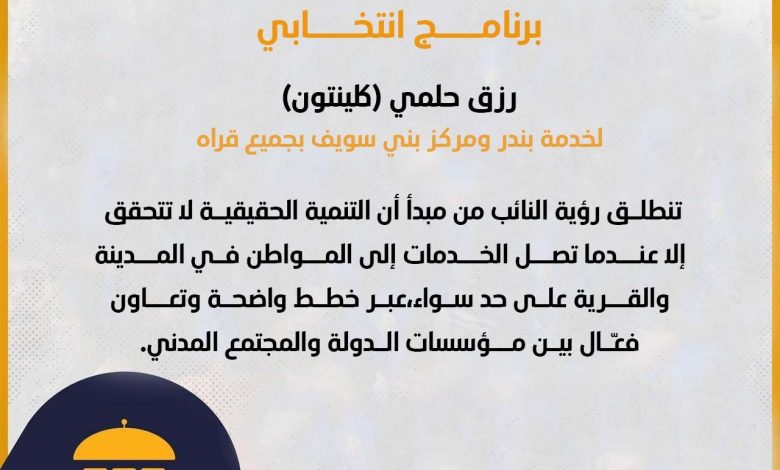 رزق حلمي كلينتون يعلن برنامجه الانتخابي لخدمة بندر ومركز بني سويف تحت شعار “خدمة الناس مسؤولية وشرف