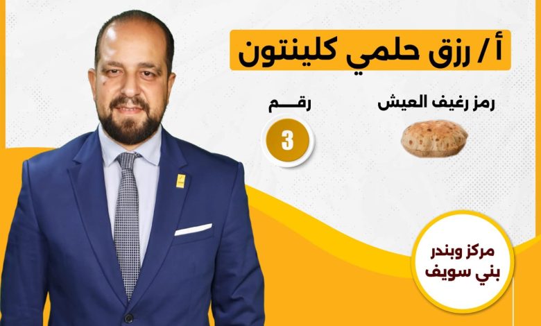 وجه رزق حلمي كلينتون، مرشح مجلس النواب عن دائرة بندر ومركز بني سويف (رقم 3 – رمز رغيف العيش)، مناشدة…