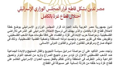 مصر تدين بشكل قاطع قرار المجلس الوزاري الإسرائيلي احتلال قطاع غزة بالكامل