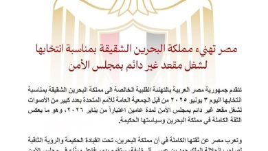 تتقدم جمهورية مصر العربية بالتهنئة القلبية الخالصة الى مملكة البحرين الشقيقة بمناسبة انتخابها اليوم ٣ يونيو ٢٠٢٥ من قبل…