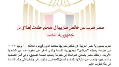 تعرب جمهورية مصر العربية عن خالص تعازيها للحادث الذي وقع يوم الثلاثاء ١٠ يونيو ٢٠٢٥ في مدرسة بمدينة “جراتس”…
