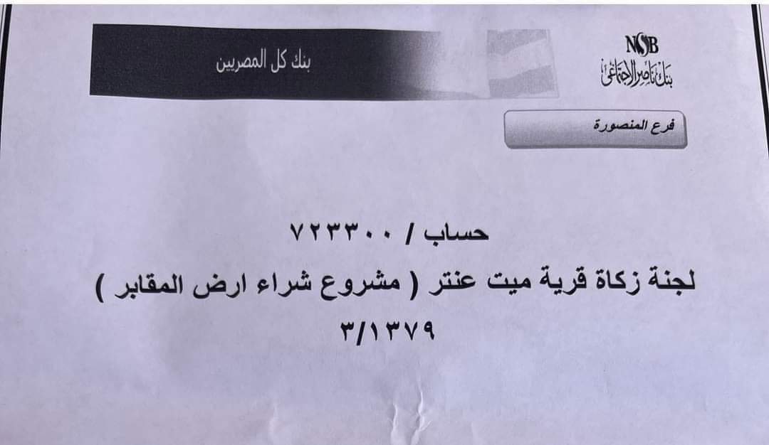 الشباب طالبوا بتبرع أهالي القرية ومشاركتهم على حساب بنكي تحت مسمى مشروع المقابر وهو حساب قانوني بمجرد اكتمال المبلغ سوف يتم دفعه للحصول على ارض مقابر ميت عنتر، ومن ثم التفكير في طريقة دفن الموتى وتوزيع المقابر على أهالي البلدة.