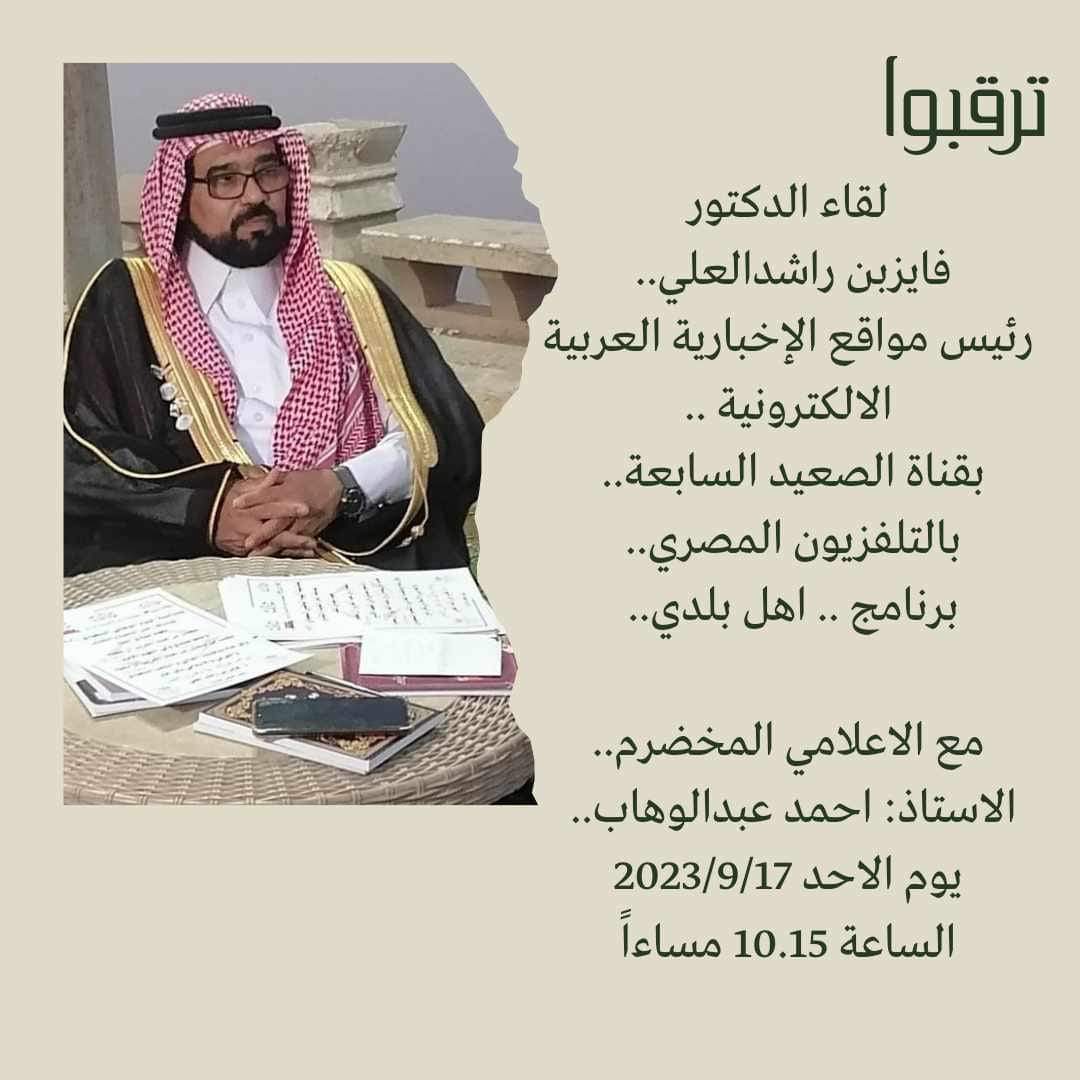 أعلن الدكتور فايز بن راشد العلي رئيس مواقع الإخبارية العربية الإلكترونية عبر صفحته الرسمية على موقع التواصل الاجتماعي فيس بوك عن لقاءه التليفزيونى غداً بقناة الصعيد السابعة ببرنامج أهل مصر مع الاعلامى أحمد
