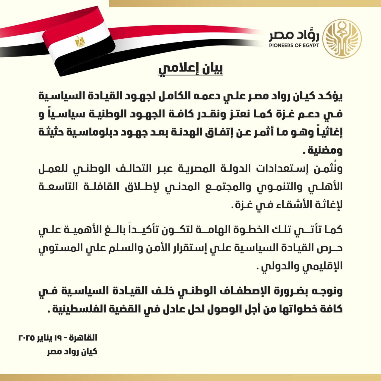 يؤكد كيان رواد مصر علي دعمه الكامل لجهود القيادة السياسية في دعم غزة كما نعتز ونقدر كافة الجهود الوطنية سياسياً و إغاثياً وهو ما أثمر عن إتفاق الهدنة بعد جهود دبلوماسية حثيثة ومضنية.