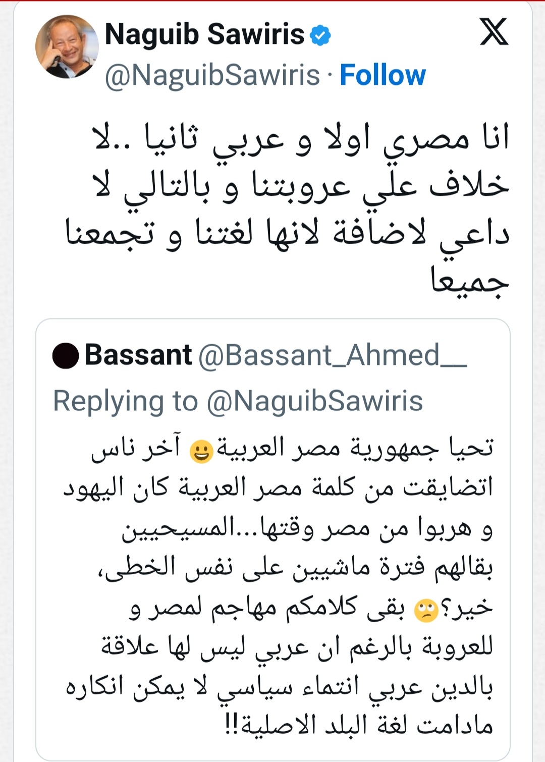 وقالت متابعة لـ ساويرس عبر منصة «إكس»: «تحيا جمهورية مصر العربية آخر ناس اتضايقت من كلمة مصر العربية كان اليهود وهربوا من مصر وقتها… المسيحيين بقالهم فترة ماشيين على نفس الخطى، خير؟ بقى كلامكم مهاجم لمصر وللعروبة بالرغم إن عربي ليس لها علاقة بالدين، عربي انتماء سياسي لا يمكن إنكاره مادامت لغة البلد الأصلية!».