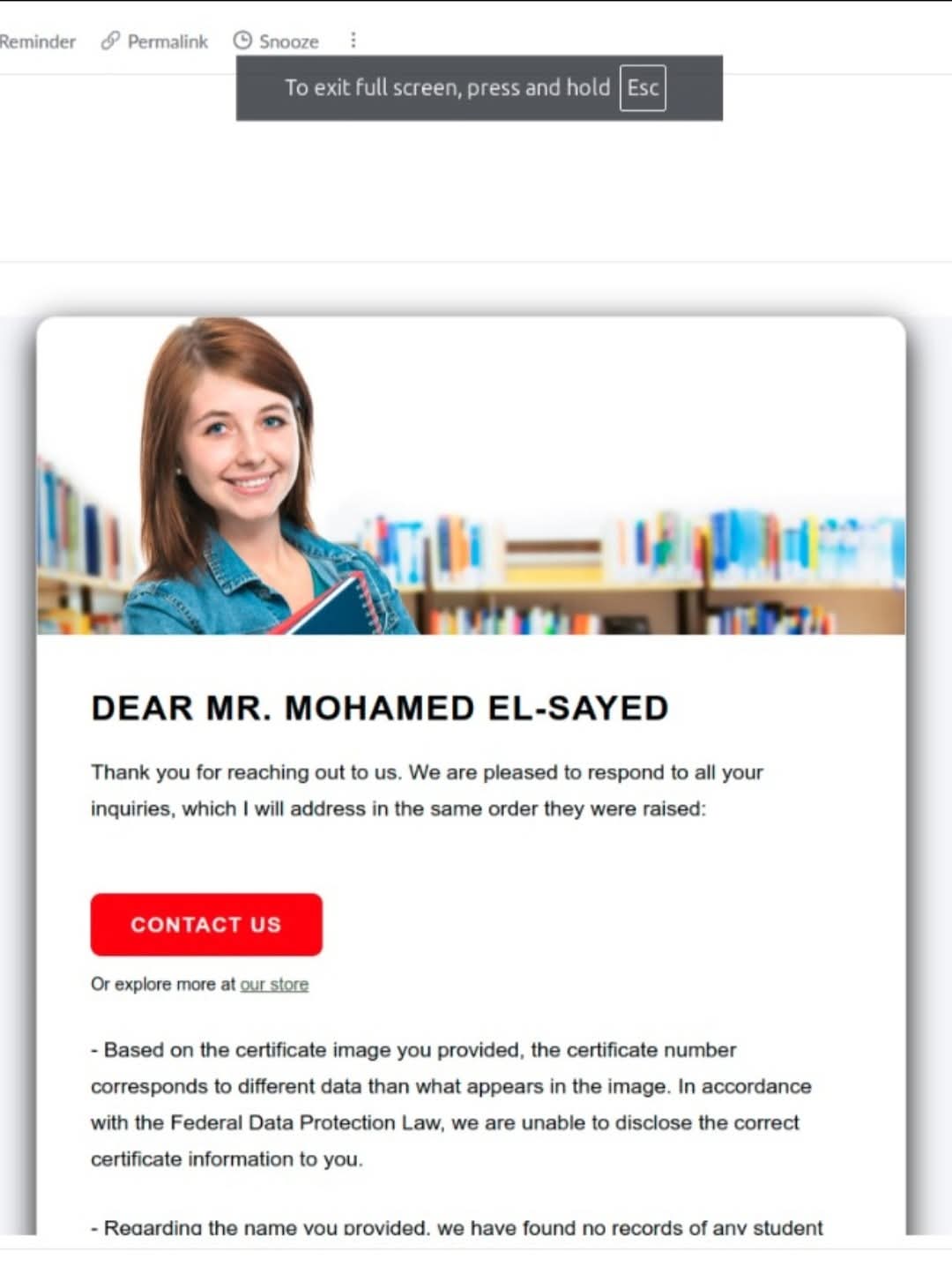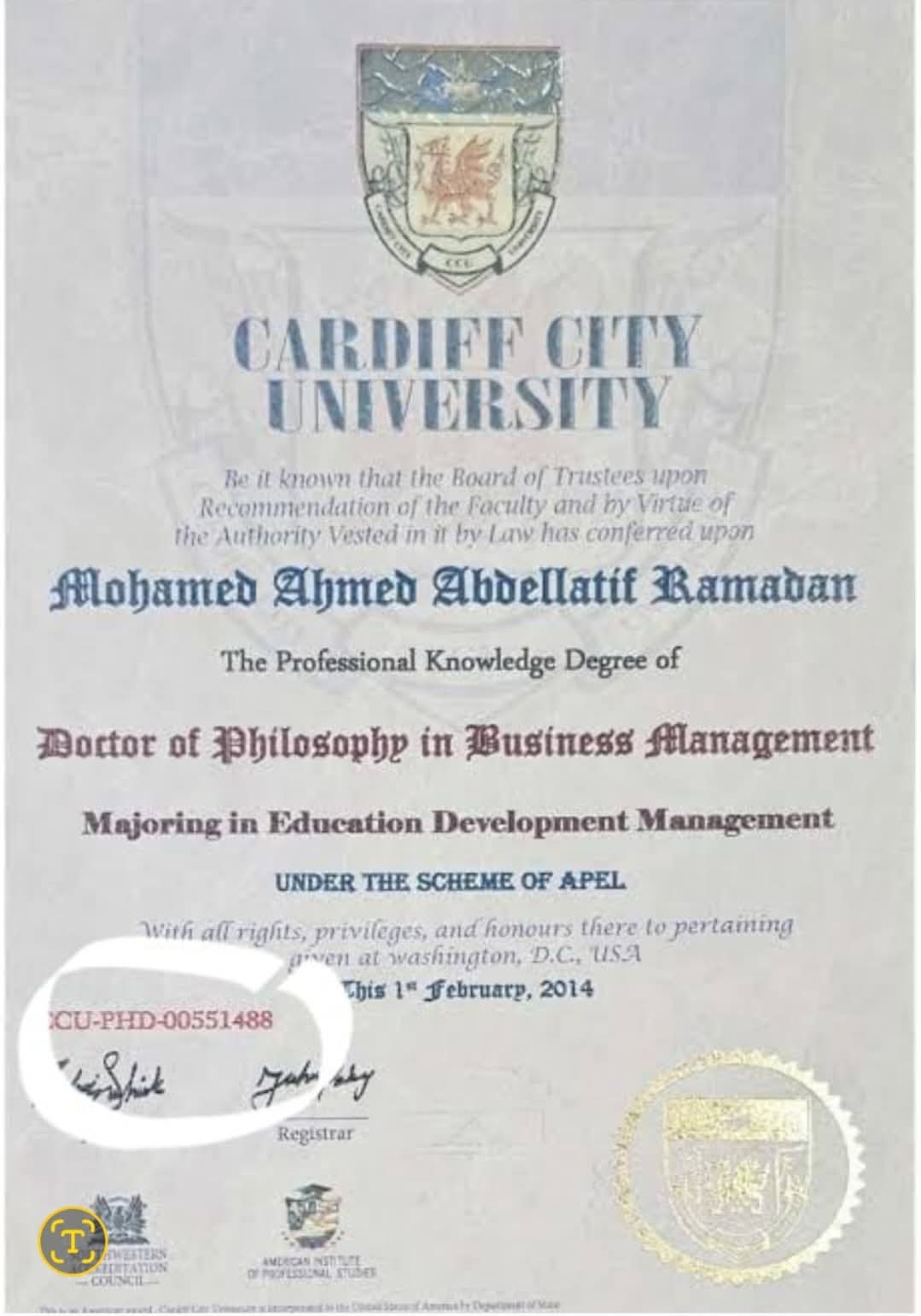 1. الشهادة مُزوَّرة: الاسم المُدرج (محمد أحمد عبداللطيف رمضان) غير موجود بسجلات الجامعة، ولم يسبق له الالتحاق بأي برامج تدريبية أو أكاديمية بها.