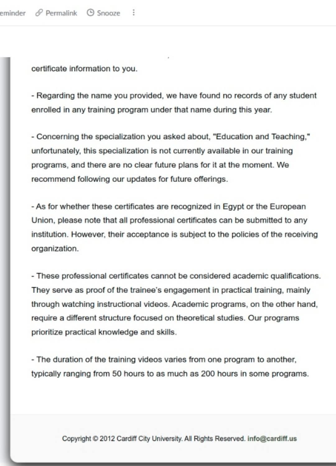 3. التخصص غير موجود: تخصص “التربية والتعليم” المذكور بالشهادة غير متوفر ضمن برامج الجامعة، ولا تخطط الجامعة لإضافته مستقبلًا.