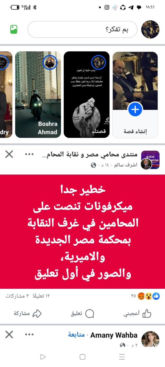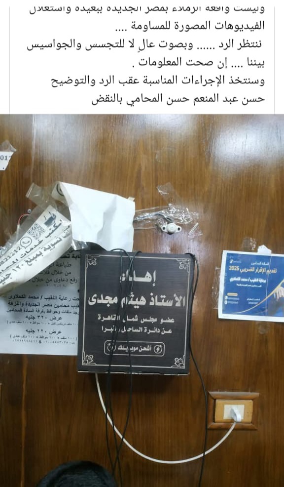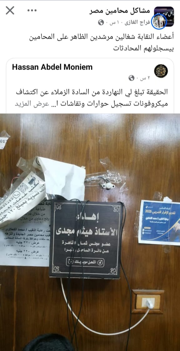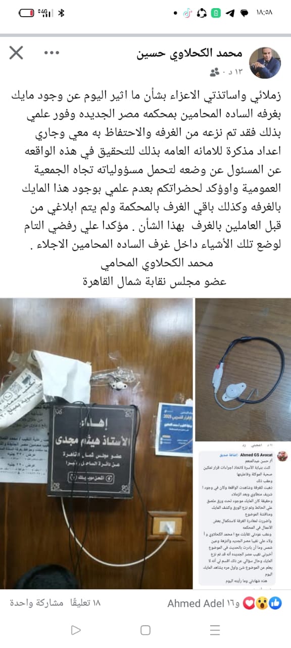 يأتي ذلك بعد نشر المحامي أحمد سالم منشوراً آخر حذر فيه من وجود أجهزة تنصت في غرف المحامين بعدد من محاكم القاهرة، بما فيها محكمتا مصر الجديدة والأميرية، مصحوباً بصور تُظهر أحد الأجهزة، مما أثار مخاوف واسعة من انتهاك سرية الاجتماعات والمستندات القانونية.