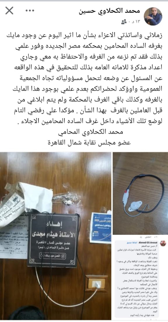 أثار اكتشاف ميكروفون تنصت داخل غرفة المحامين بمحكمة مصر الجديدة جدلاً واسعاً بين أعضاء النقابة، حيث أكد المحامي عبد الحميد منير، المحامي بالنقض، أن المحامي محمد الكحلاوي، عضو مجلس نقابة المحامين بشمال القاهرة، قد نشر إفادة داخل إحدى مجموعات المحامين على تطبيق “فيس بوك” تفيد باكتشاف جهاز تنصت داخل الغرفة المخصصة للمحامين بالمحكمة.