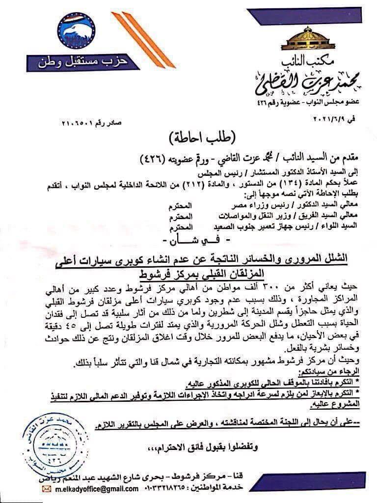 استجابة لطلب الإحاطة المقدم من النائب محمد عزت القاضي، عضو لجنة العلاقات الخارجية بمجلس النواب، تم افتتاح الكوبري العلوي بمزلقان فرشوط بمحافظة قنا، في خطوة طالما انتظرها أهالي المركز لسنوات.