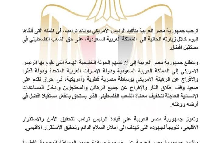 ترحب جمهورية مصر العربية بتأكيد الرئيس الأمريكي دونالد ترامب، فى كلمته التى ألقاها اليوم خلال زيارته الحالية إلى المملكة العربية السعودية، على حق الشعب الفلسطيني في مستقبل أفضل.
