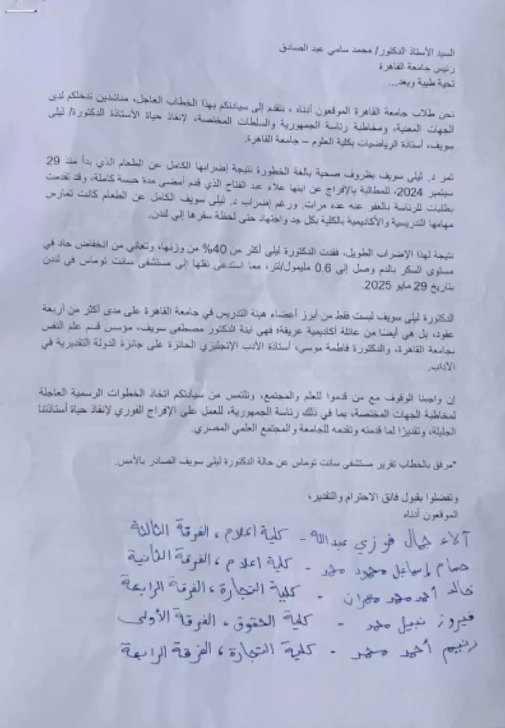 وشدّد الطلبة في مناشدتهم على “واجب الوقوف مع من قدموا للعلم والمجتمع”، مطالبين رئيس الجامعة باتخاذ إجراءات عاجلة لمخاطبة الجهات المختصة، ومن بينها رئاسة الجمهورية، للإفراج الفوري عن علاء عبد الفتاح وإنقاذ حياة أستاذتهم. ورفقوا الخطاب بتقرير طبي من مستشفى سانت توماس يؤكد حالتها الصحية الحرجة.