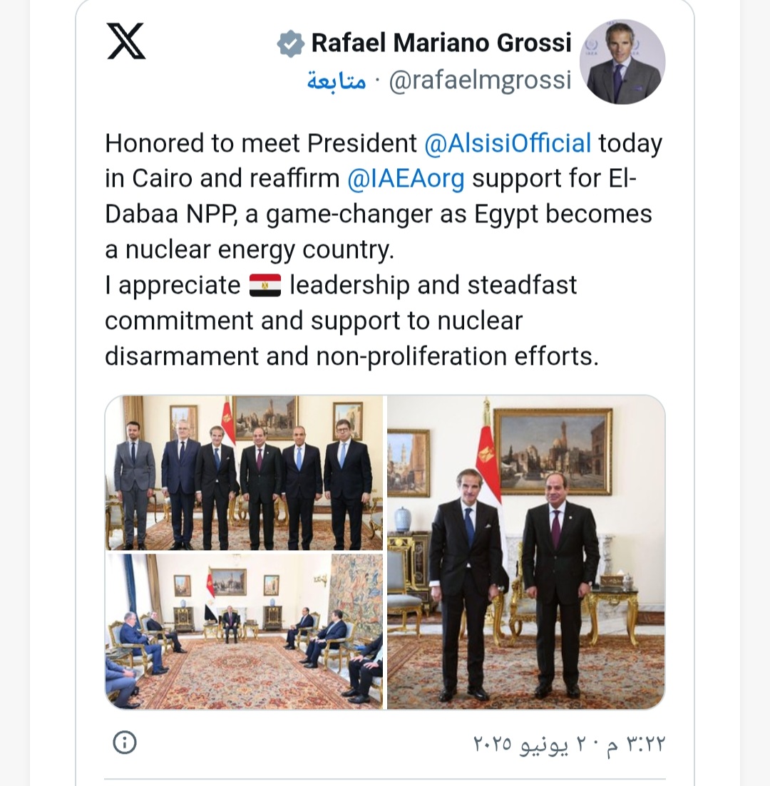 من جانبه، أكد الرئيس السيسي خلال اللقاء -الذي حضره وزير الخارجية بدر عبد العاطي ورئيس المخابرات العامة اللواء حسن رشاد- تقدير مصر لدور الوكالة في دعم عدم الانتشار النووي. وأشار إلى حرص مصر على تعظيم الاستفادة من الاستخدامات السلمية للطاقة الذرية، معتبرًا محطة الضبعة ركيزة أساسية لتلبية الاحتياجات المتزايدة من الطاقة. كما جدد التأكيد على دعم مصر لإنشاء منطقة خالية من الأسلحة النووية في الشرق الأوسط.