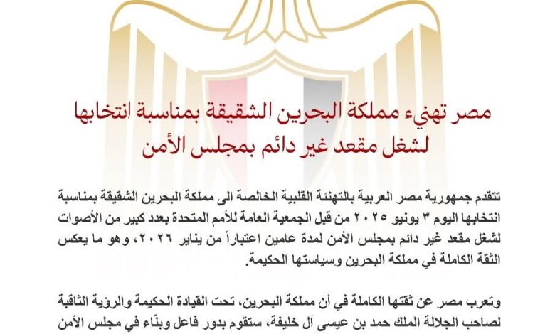 تتقدم جمهورية مصر العربية بالتهنئة القلبية الخالصة الى مملكة البحرين الشقيقة بمناسبة انتخابها اليوم ٣ يونيو ٢٠٢٥ من قبل الجمعية العامة للأمم المتحدة بعدد كبير من الأصوات لشغل مقعد غير دائم بمجلس الأمن لمدة عامين اعتباراً من يناير ٢٠٢٦، وهو ما يعكس الثقة الكاملة في مملكة البحرين وسياستها الحكيمة.