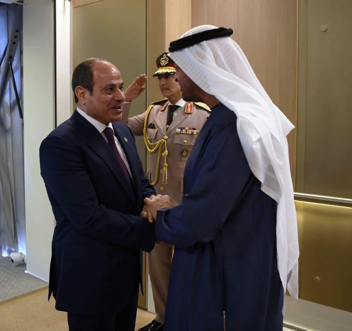 وكان في استقبال الرئيس المصري لدى وصوله إلى مطار الرئاسة، الشيخ محمد بن زايد آل نهيان، رئيس دولة الإمارات.