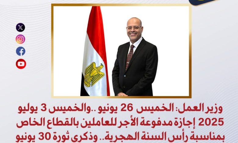 وزير العمل: الخميس 26 يونيو ..والخميس 3 يوليو 2025 إجازة مدفوعة الأجر للعاملين بالقطاع الخاص بمناسبة رأس السنة الهجرية.. وذكرى ثورة 30 يونيو