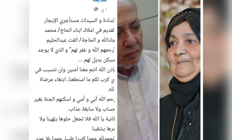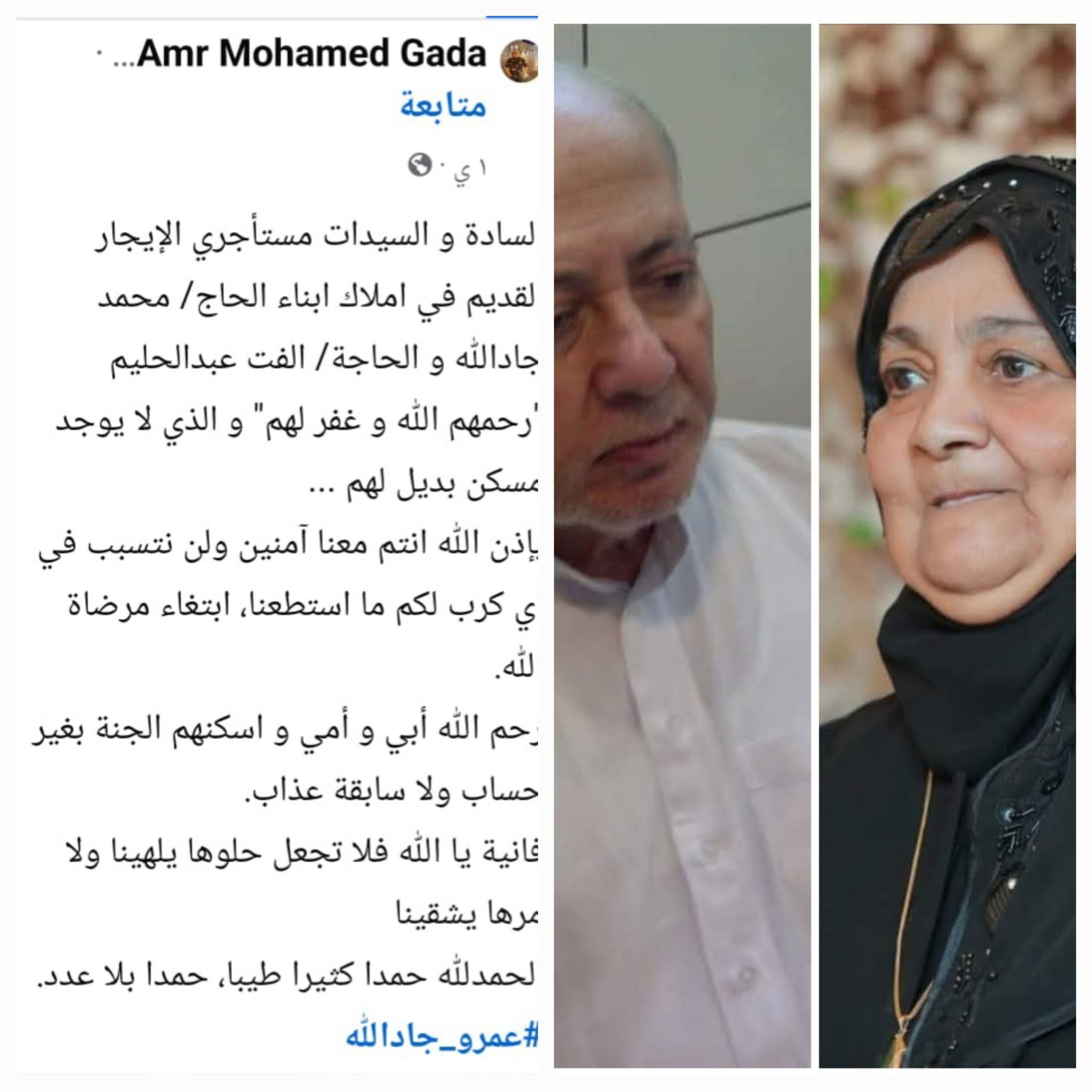 “السادة والسيدات مستأجري الإيجار القديم في أملاك أبناء الحاج/ محمد جادالله والحاجة/ الفت عبدالحليم (رحمهم الله وغفر لهم)، والذي لا يوجد مسكن بديل لهم… بإذن الله أنتم معنا آمنين، ولن نتسبب في أي كرب لكم ما استطعنا، ابتغاء مرضاة الله. رحم الله أبي وأمي، وأسكنهم الجنة بغير حساب ولا سابقة عذاب. فانية يا الله فلا تجعل حلوها يلهينا ولا مرها يشقينا. الحمد لله حمدًا كثيرًا طيبًا، حمدًا بلا عدد.”