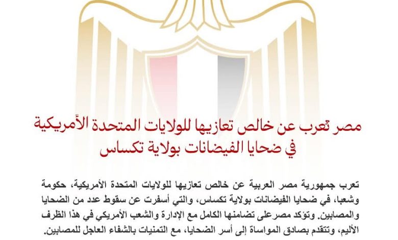 تعرب جمهورية مصر العربية عن خالص تعازيها للولايات المتحدة الأمريكية، حكومة وشعبا، في ضحايا الفيضانات بولاية تكساس، والتي أسفرت عن سقوط عدد من الضحايا والمصابين. وتؤكد مصرعلى تضامنها الكامل مع الإدارة والشعب الأمريكي في هذا الظرف الأليم، وتتقدم بصادق المواساة إلى أسر الضحايا، مع التمنيات بالشفاء العاجل للمصابين.