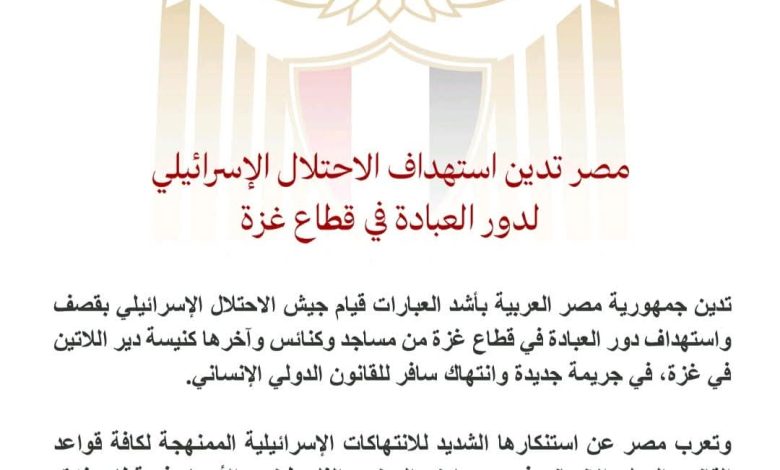 تدين جمهورية مصر العربية بأشد العبارات قيام الجيش الاسرائيلي بقصف واستخدام دور العبادة فى قطاع غزة من مساجد وكنائس أخرها كنيسة اللاتينية فى غزة فى جريمة جديدة وانتهاك سافر للقانون الدولى الانسانى