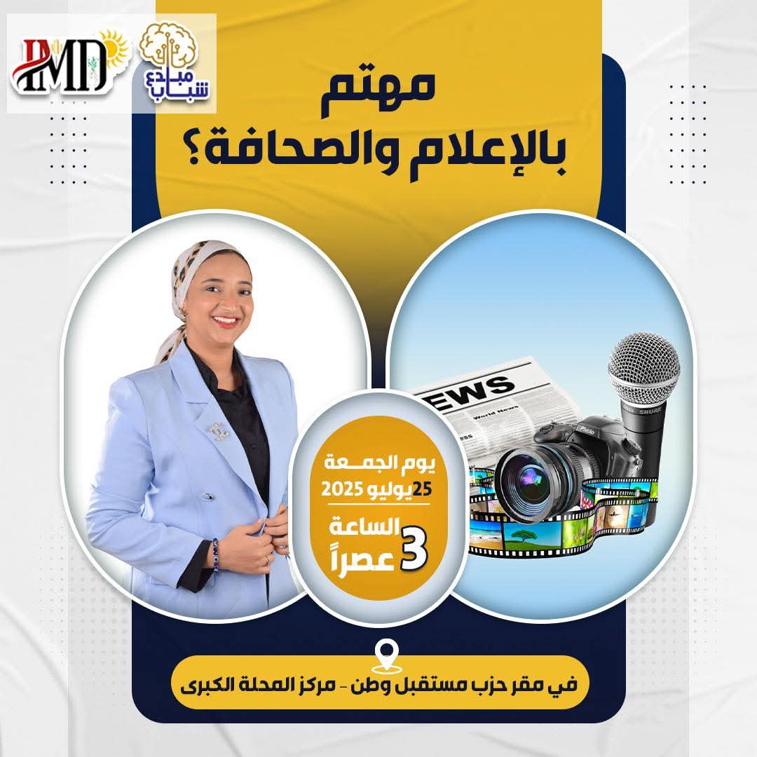 في إطار دعم الشباب وتأهيلهم لسوق العمل الإعلامي، تنظم مبادرة “إعلامنا شبابنا” ورشة تدريبية متميزة بعنوان “الصحافة بأسلوب جديد”، يوم الجمعة الموافق 25 يوليو 2025، في تمام الساعة الثالثة عصرًا، بمقر حزب مستقبل وطن بمركز المحلة الكبرى (خلف مجلس المدينة – أمام مباحث التموين – عمارة الحاج محمد جلال – الدور الثالث).