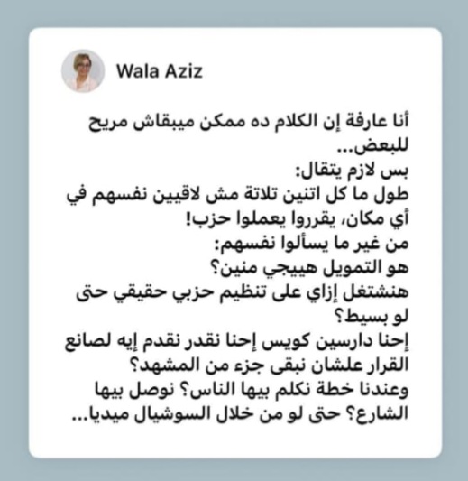 وتساءلت: “هو التمويل هييجي منين؟ هنشتغل إزاي على تنظيم حزبي حقيقي حتى لو بسيط؟ إحنا دارسين كويس إحنا نقدر نقدم إيه لصانع القرار علشان نبقى جزء من المشهد؟ وعندنا خطة نكلم بيها الناس؟ نوصل بيها الشارع؟ حتى لو من خلال السوشيال ميديا؟”
