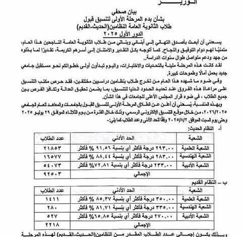 أعلنت وزارة التعليم العالي عن انطلاق المرحلة الأولى لتنسيق القبول بالجامعات والمعاهد للعام الجامعي 2026/2025، من خلال موقع التنسيق الإلكتروني الرسمي، خلال الفترة من الثلاثاء 29 يوليو الجاري وحتى السبت 2 أغسطس المقبل، وفقاً للحد الأدنى وعدد الطلاب كما يلي: