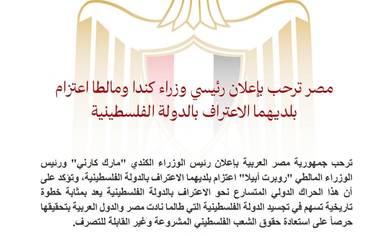 ترحب جمهورية مصر العربية بإعلان رئيس الوزراء الكندي “مارك كارني” ورئيس الوزراء المالطي “روبرت أبيلا” اعتزام بلديهما الاعتراف بالدولة الفلسطينية، وتؤكد على أن هذا الحراك الدولي المتسارع نحو الاعتراف بالدولة الفلسطينية يعد بمثابة خطوة تاريخية تسهم في تجسيد الدولة الفلسطينية التي طالما نادت مصر والدول العربية بتحقيقها حرصاً على استعادة حقوق الشعب الفلسطيني المشروعة وغير القابلة للتصرف.