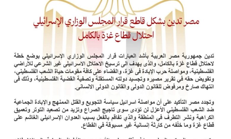 مصر تدين بشكل قاطع قرار المجلس الوزاري الإسرائيلي احتلال قطاع غزة بالكامل