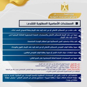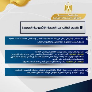 نشرت وزارة الإسكان والمرافق والمجتمعات العمرانية، إنفوجرافاً يوضح كيفية تلقي طلبات المستأجرين المنطبق عليهم القواعد والشروط والإجراءات اللازمة للحصول على وحدات بديلة، وذلك بداية من أول أكتوبر 2025 ولمدة ٣ أشهر، من خلال المنصة الإلكترونية الموحدة أو مكاتب البريد على مستوى الجمهورية.
