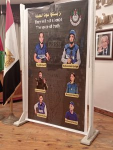 خارج قاعة الفعالية، وقف النقيب خالد البلشي وعدد من الصحفيين حاملين الشموع أمام صور الشهداء من الصحفيين والأطفال، فيما زُينت القاعة بلافتات كُتب عليها: “لن يسكتوا صوت الحقيقة”، “التهجير خط أحمر”، “أوقفوا الإبادة بالتجويع.. حاكموا مجرمي الحرب”.