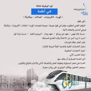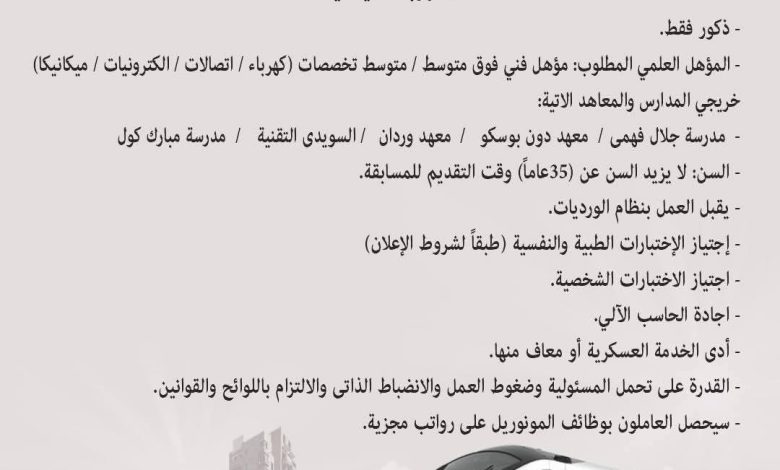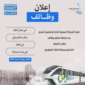 تعلن الشركة المصرية لإدارة وتشغيل المترو (E.C.M) عن حاجتها لشغل وظائف بنظام التعاقد للعمل في تشغيل وصيانة قطار المونوريل.