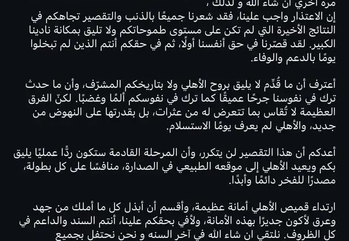 وكانت الإدارة قد شددت في وقت سابق على منع اللاعبين من نشر أو التعليق عبر وسائل التواصل الاجتماعي حفاظا على تركيزهم وعدم إثارة أي جدل قد يؤثر على استقرار الفريق.