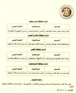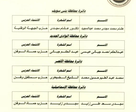 ووفق القرار فاز فى محافظة الغربية مجدى السيد عب الله البري بإجمالي عدد أصوات 217193 ناخبًا، وفى محافظة بنى سويف هشام محمد مجدى محمد عبد المجيد، بإجمالي عدد أصوات 139467 ناخبًا، وفي محافظة الاقصر محمد عبد العليم حسين محمد بإجمالي عدد أصوات 51203 ناخبًا، وفى محافظة الإسماعيلية مجدى سعد على زايد، بإجمالي عدد أصوات 39216 ناخبًا، وفى محافظة الوادى الجديد
