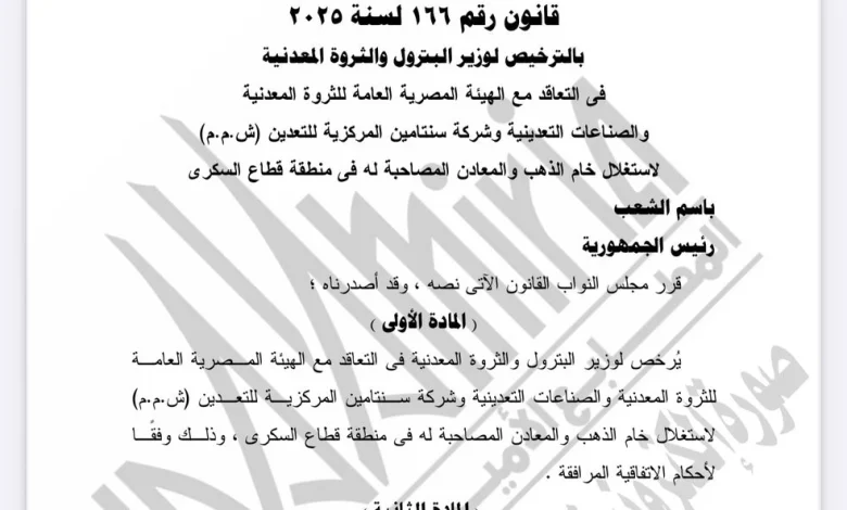 نشرت الجريدة الرسمية تصديق السيد الرئيس عبد الفتاح السيسى، على القانون رقم 166 لسنة 2025 بالترخيص لوزير البترول والثروة المعدنية فى التعاقد مع الهيئة المصرية العامة للثروة المعدنية والصناعات التعدينية وشركة سنتامين المركزية للتعدين (ش.م.م) لاستغلال خام الذهب والمعادن المصاحبة له فى منطقة قطاع السكرى.