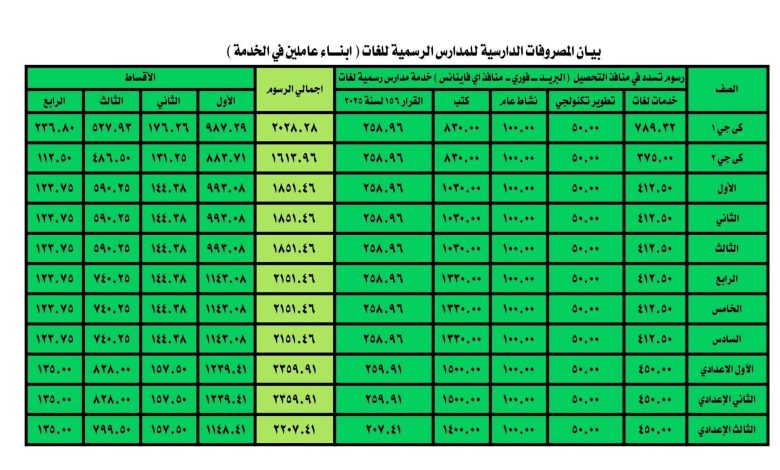 واكدت وزارة التربية والتعليم ، اتاحة تقسيط المصروفات على أربعة أقساط، حيث أرسلت الوزارة خطابًا للمديريات التعليمية في جميع المحافظات جاء فيه: إيماء إلى صدور القرار الوزاري رقم ( 224 ) بتاريخ ( 2025/9/7 ) ، بشأن المدارس الرسمية للغات والمدراس الرسمية المتميزة للغات والمتضمنة الإجراءات الخاصة بتحصيل كافة مبالغ المصروفات مقابل الخدمات والرسوم وثمن الكتب ومقابل الانتفاع وكافة ما يستحق من مبالغ مالية عبر منافذ التحصيل الموجودة بقرار وزير التربية والتعليم والتعليم الفني.