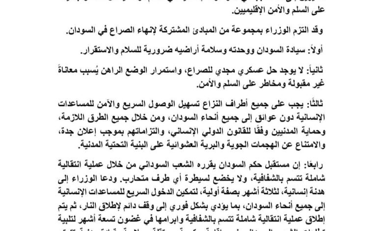 وقد أكد البيان على ضرورة الحفاظ على سيادة ووحدة السودان وسلامته الإقليمية كعناصر أساسية للأمن والاستقرار في السودان، وتكثيف المساعدات الإنسانية لجميع أبناء الشعب السوداني الشقيق، وإنهاء تدفقات السلاح التي تطيل من أمد النزاع.