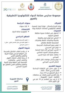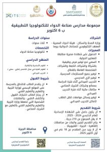 وفي ضوء هذه الجهود، تعلن وزارة التربية والتعليم والتعليم الفني، من خلال وحدة تشغيل وإدارة مدارس التكنولوجيا التطبيقية، عن إضافة مدارس جديدة في قطاع الدواء بالتعاون مع وزارة الصحة والسكان، وهيئة الدواء المصرية، والمعهد التكنولوجي للصناعات الدوائية بروما، وتضم: