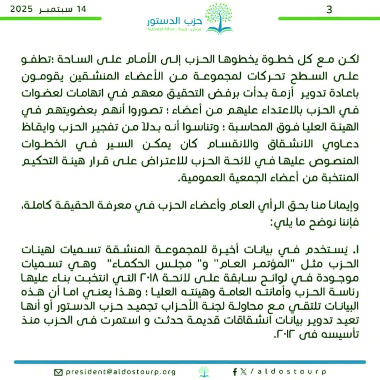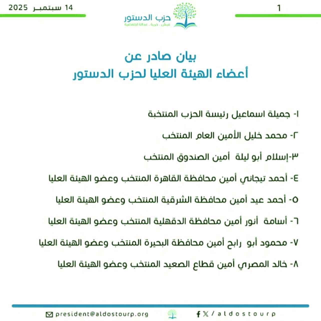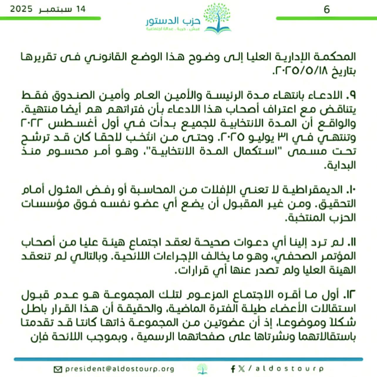 حزب الدستور يرد: بيان من الهيئة العليا يكشف الحقائق كاملة ويواجه الأكاذيب