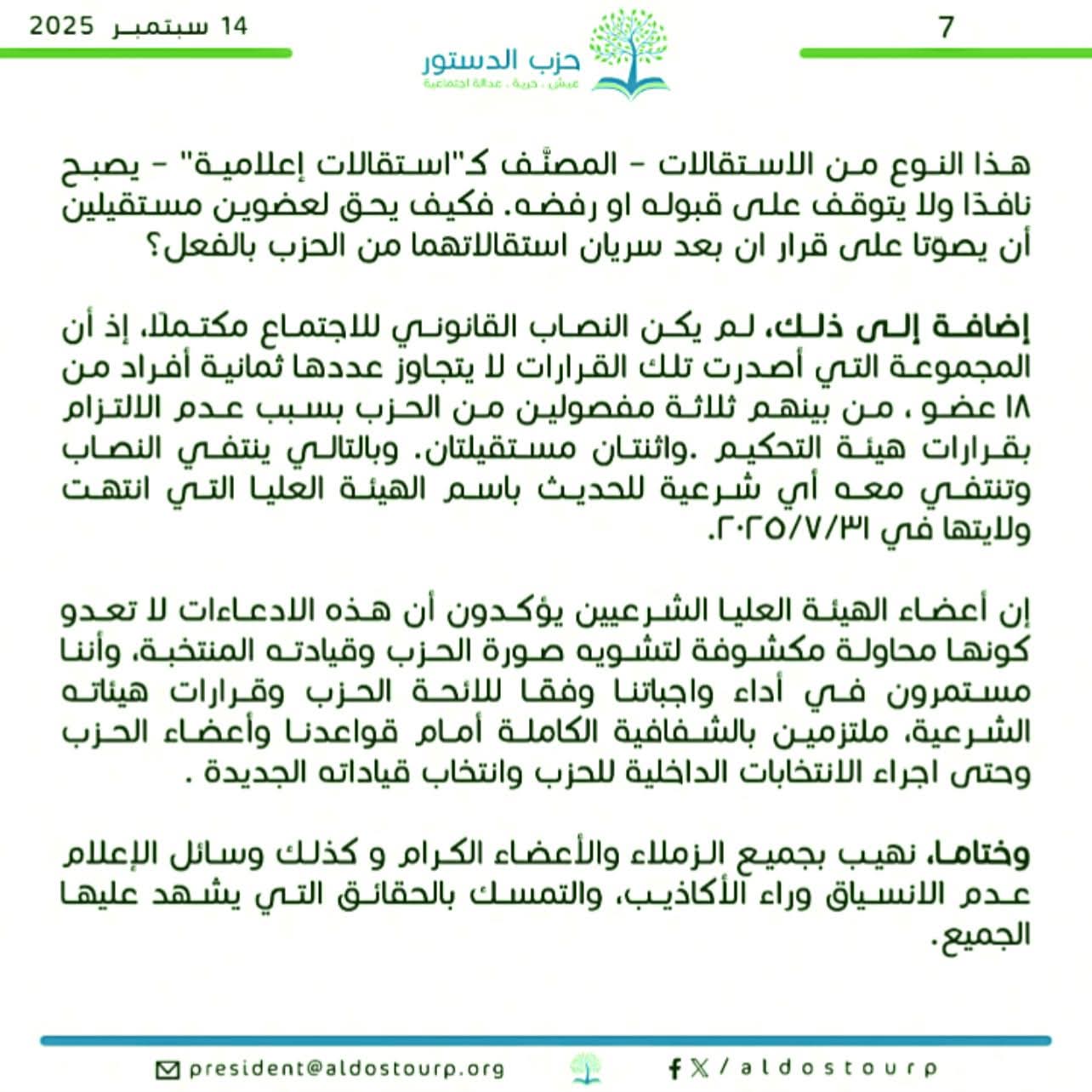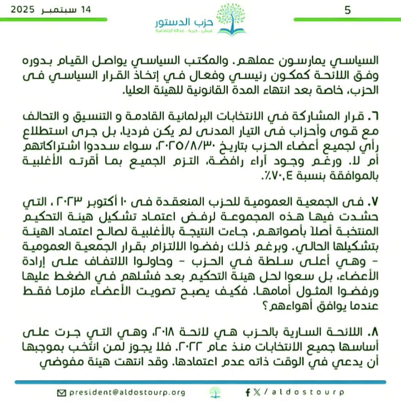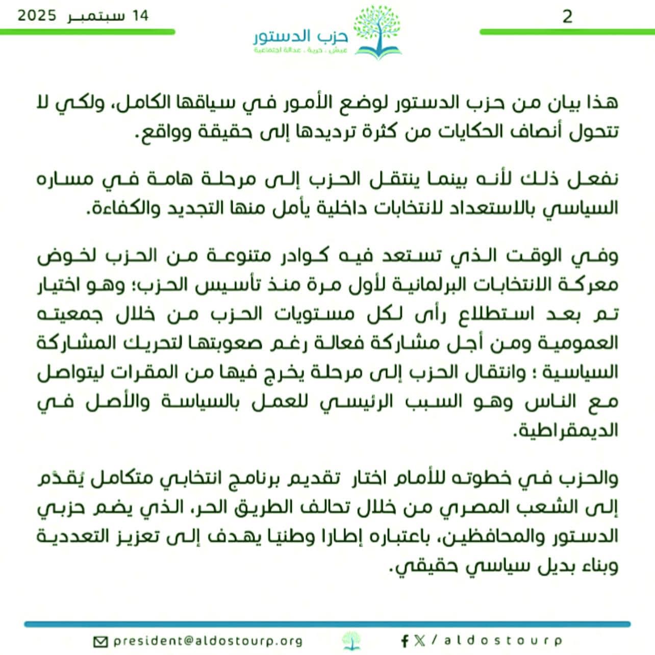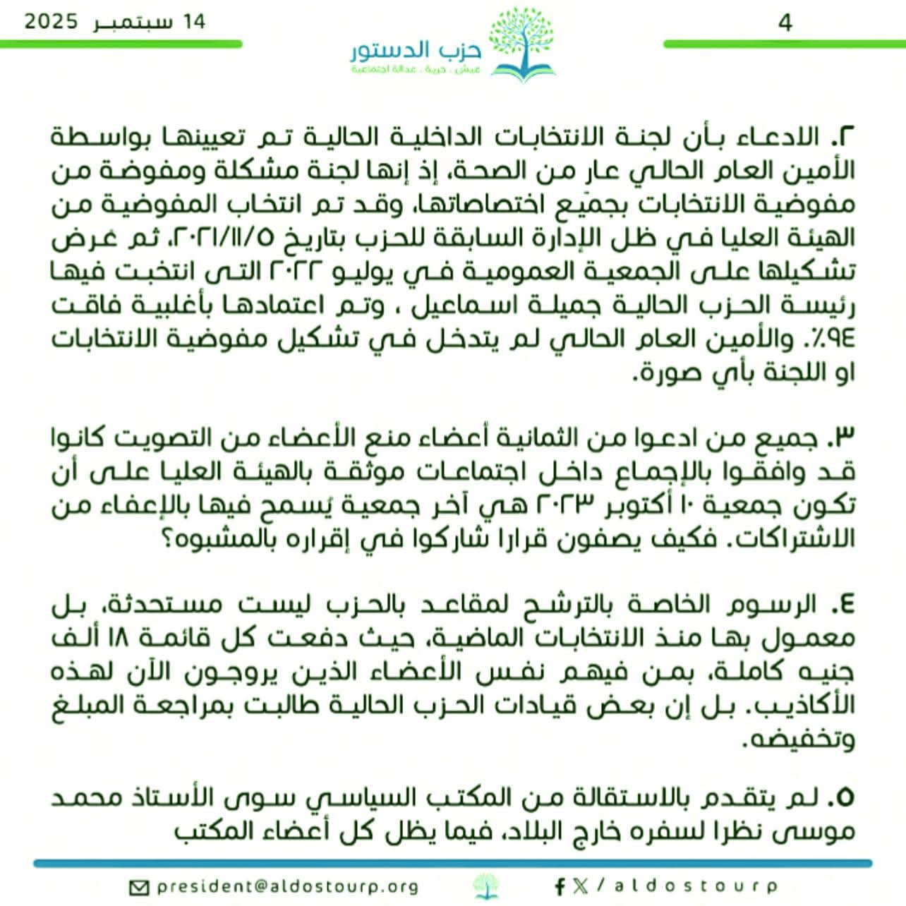 حزب الدستور يرد: بيان من الهيئة العليا يكشف الحقائق كاملة ويواجه الأكاذيب