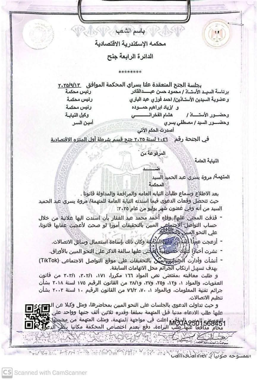 أصدرت محكمة الإسكندرية الاقتصادية – الدائرة الرابعة جنح، برئاسة المستشار محمود حسن عبد القادر وعضوية المستشارين أحمد فوزي عبد الباري وزياد إبراهيم حمودة، حكمها في القضية رقم ١٠٤٦ لسنة ۲۰٢٥ جنح قسم أول المنتزه الاقتصادية، والمتهمة فيها مروة يسري عبد الحميد السيد.