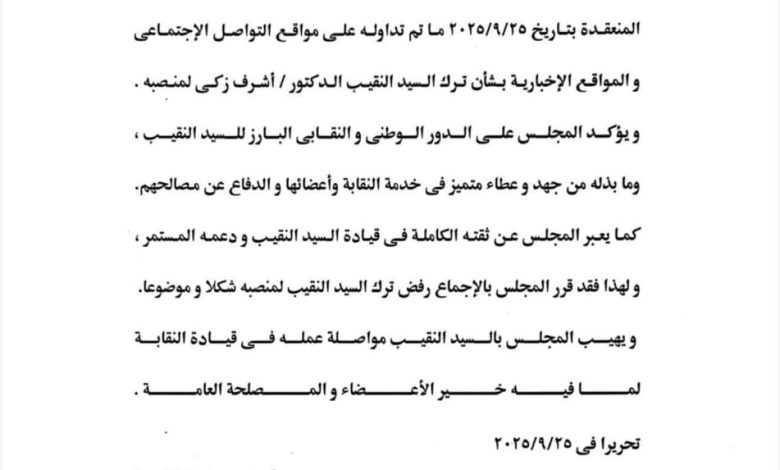 تابع مجلس أدارة المهن التمثيلية، في جلسته الطارئة المنعقدة ٢٥-٩-٢٠٢٥ ما تم تداوله عبر مواقع التواصل الأجتماعي والمواقع الإخبارية، بشأن ترك الدكتور أشرف زكي لمنصبه، ويوكد المجلس علي الدور الوطني والنقابي البارز للسيد النقيب، وما بذله من جهد وعطاء متميز في خدمة النقابة وأعضائها، والدفاع عن مصالحها، كما يعبر المجلس عن ثقته الكاملة في قيادة السيد النقيب ودعمه المستمر، ولهذا قرر المجلس بالاجماع رفض ترك منصب النقيب لمنصبه شكلا وموضوعا، ويهيب المجلس السيد النقيب مواصلة عمله في قيادة النقابة لما فيه خير الأعضاء والمصلحة العامة.