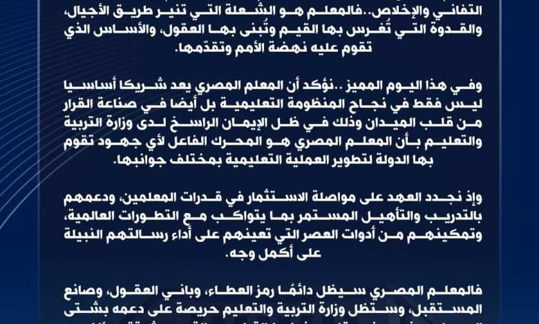 وفي هذا اليوم المميز..نؤكد أن المعلم المصري يعد شريكا أساسيا ليس فقط في نجاح المنظومة التعليمية بل أيضا في صناعة القرار من قلب الميدان وذلك في ظل الإيمان الراسخ لدى وزارة التربية والتعليم بأن المعلم المصري هو المحرك الفاعل لأي جهود تقوم بها الدولة لتطوير العملية التعليمية بمختلف جوانبها.