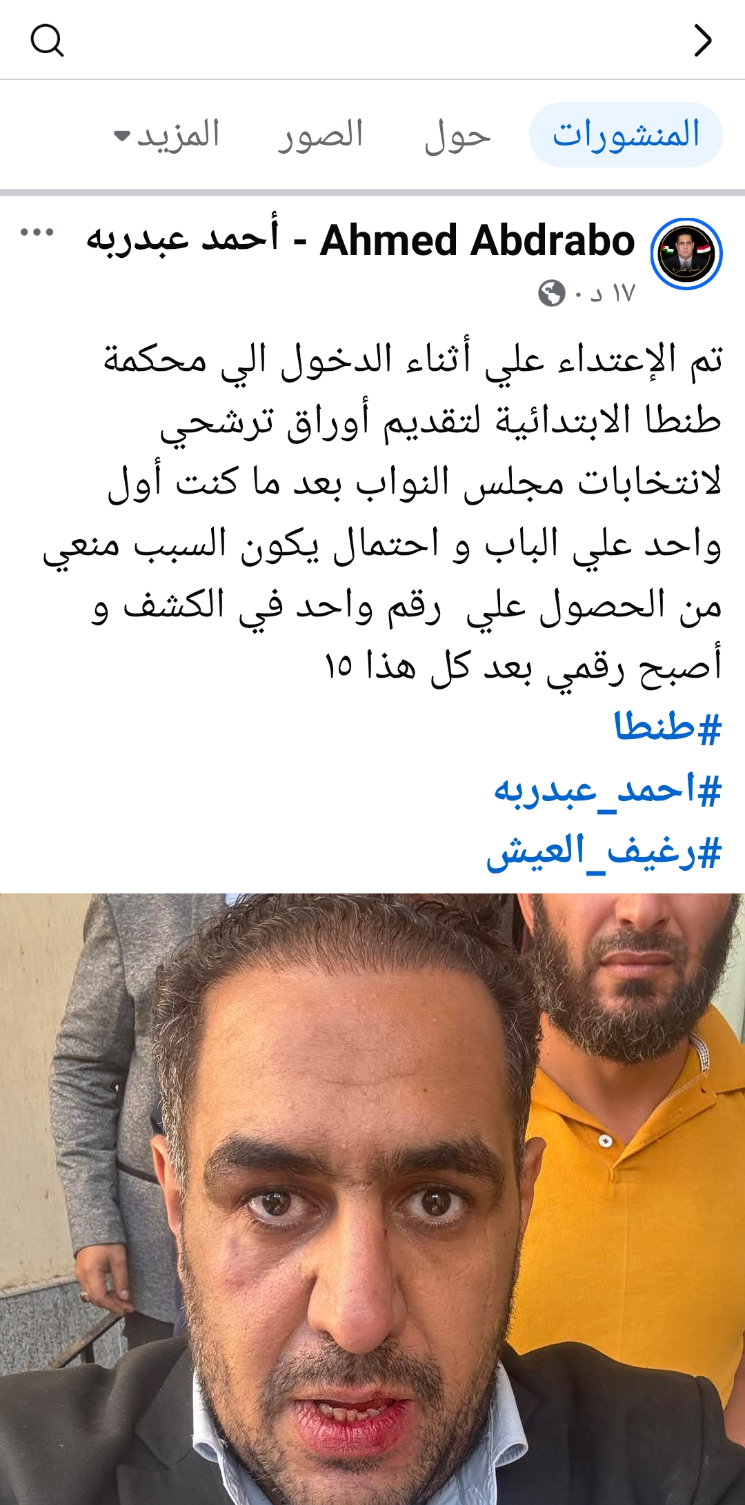وأوضح عبد ربه، في منشور عبر صفحته الرسمية على موقع التواصل الاجتماعي فيسبوك، أنه كان من أوائل الحاضرين أمام باب المحكمة، إلا أنه فوجئ – على حد قوله – بتعرضه للاعتداء ومنعه من الدخول في التوقيت المحدد، ما أدى إلى تأخر ترتيبه في كشوف الترشح ليصبح رقم 15 بدلاً من الرقم الأول الذي كان يسعى للحصول عليه.