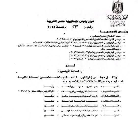 نشرت الجريدة الرسمية ـ قرار الرئيس عبدالفتاح #السيسي ، بإعادة تشكيل مجلس إدارة الهيئة العامة للاستعلامات ـ برئاسة/ضياء رشوان و جاء التشكيل كالآتي :