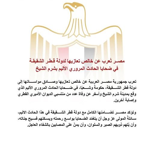 تعرب جمهورية مصر العربية عن خالص تعازيها وصادق مواساتها إلى دولة قطر الشقيقة، حكومة وشعبًا، في ضحايا الحادث المروري الأليم الذي وقع بمدينة شرم الشيخ وأسفر عن وفاة عدد من منتسبي الديوان الأميري القطري وإصابة آخرين.